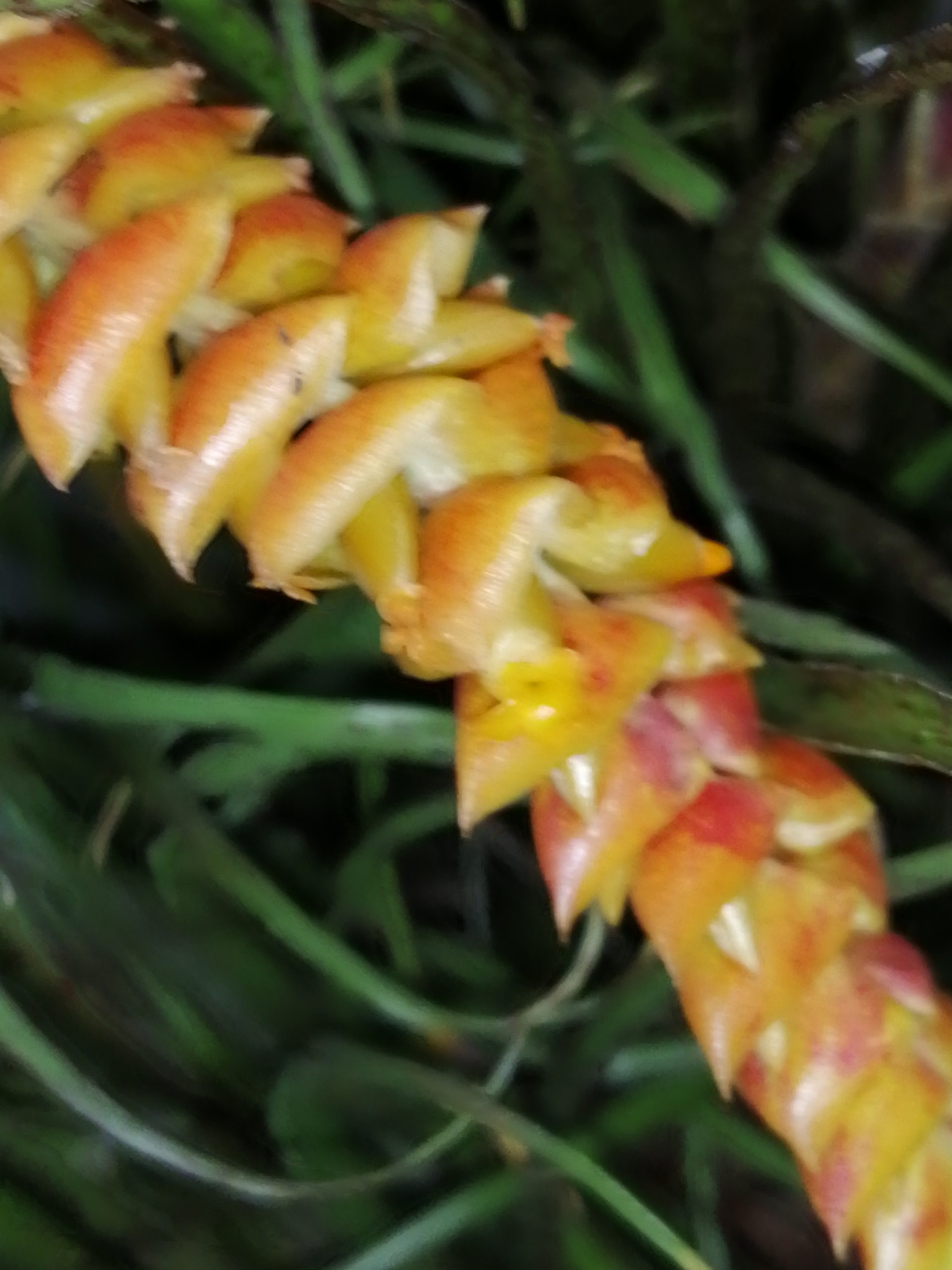 Originaria della Colombia, appartiene alla stessa famiglia delle Tillandsia. Ama l’umidità dell’aria ed ha straordinarie foglie sottili, compatte, arricciate rosso verdi che contrastano con i fiori gialli.