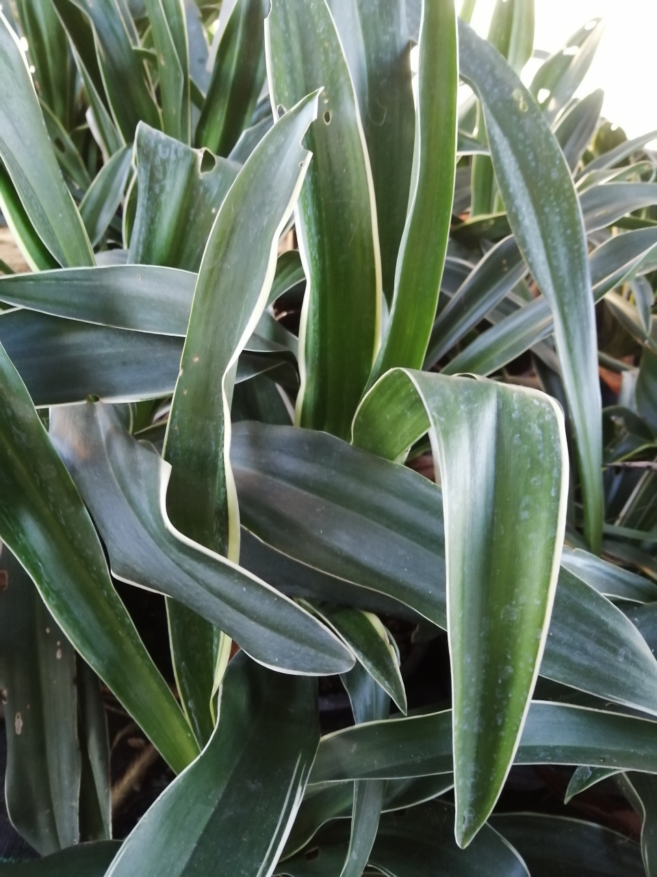 Dal rizoma si dipartono le caratteristiche foglie allungate, dal verde scuro ed intenso con i margini giallo crema.