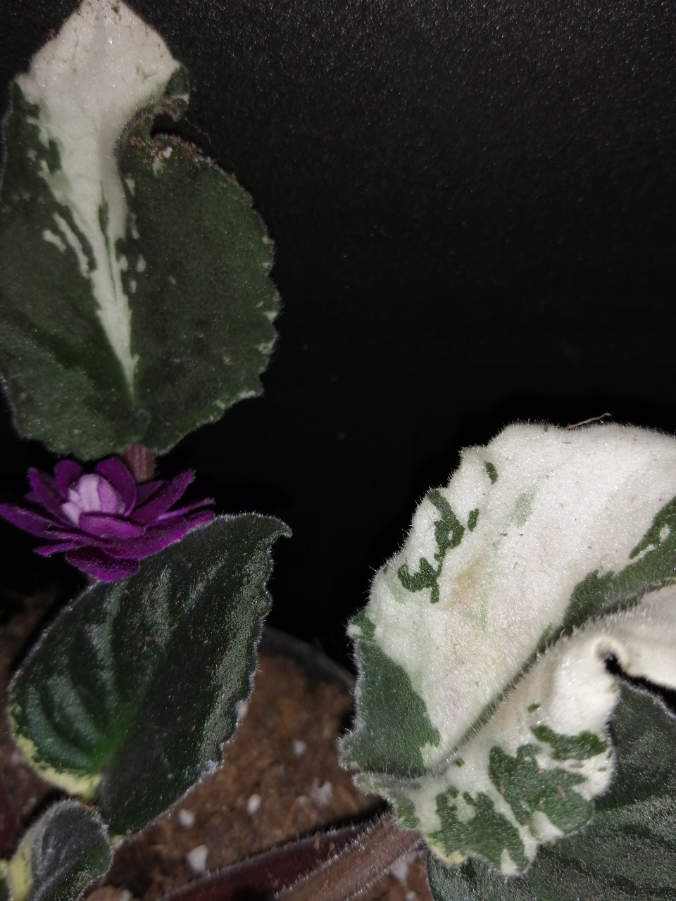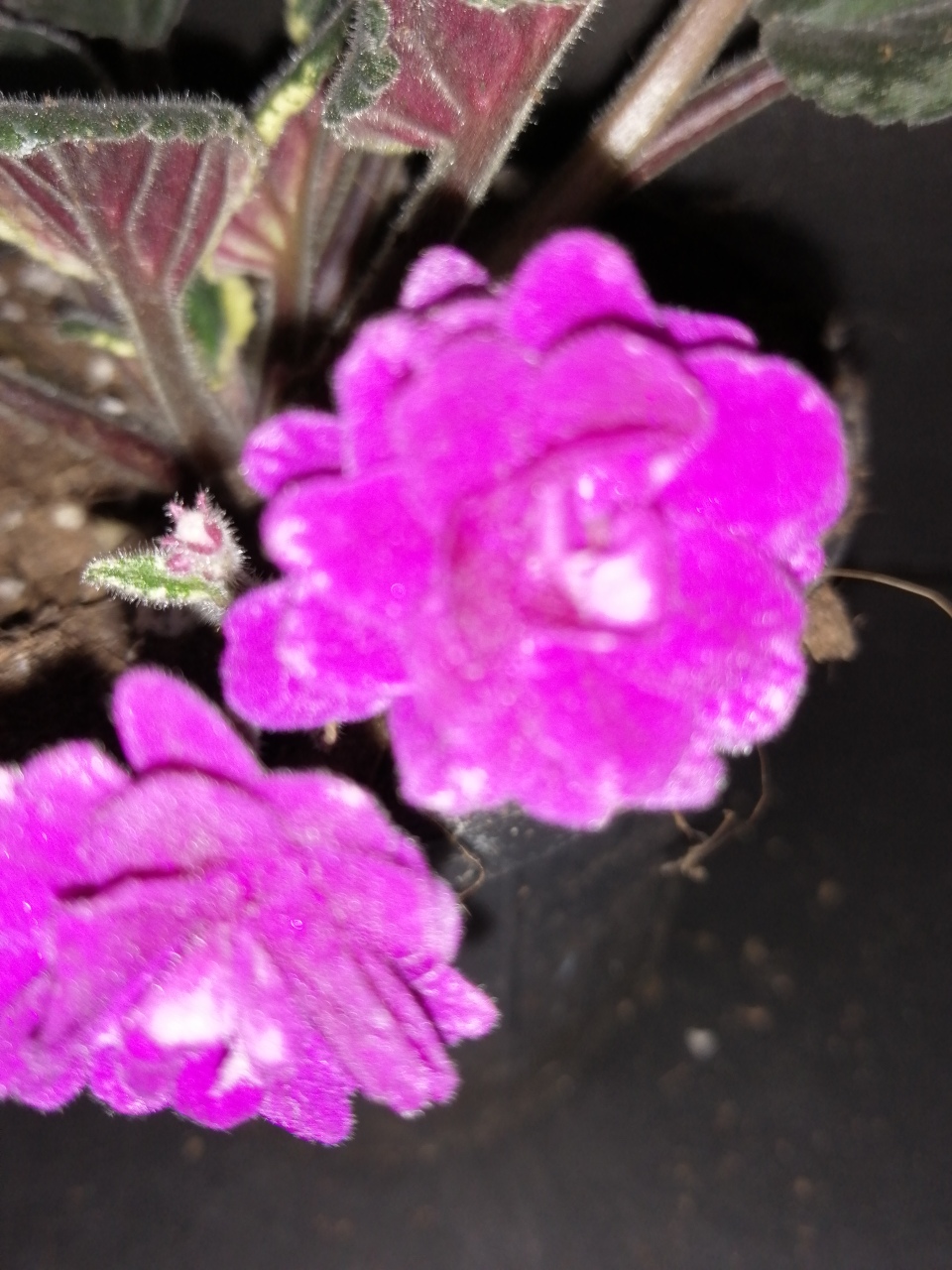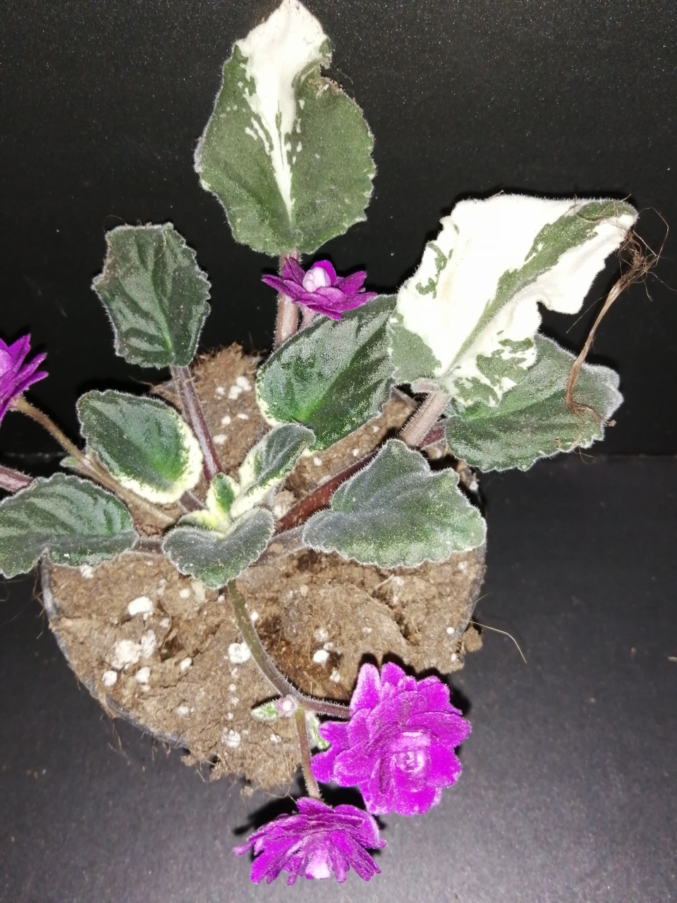 Una novità dal fogliame screziato di bianco. Fiori doppi porpora scuro.
