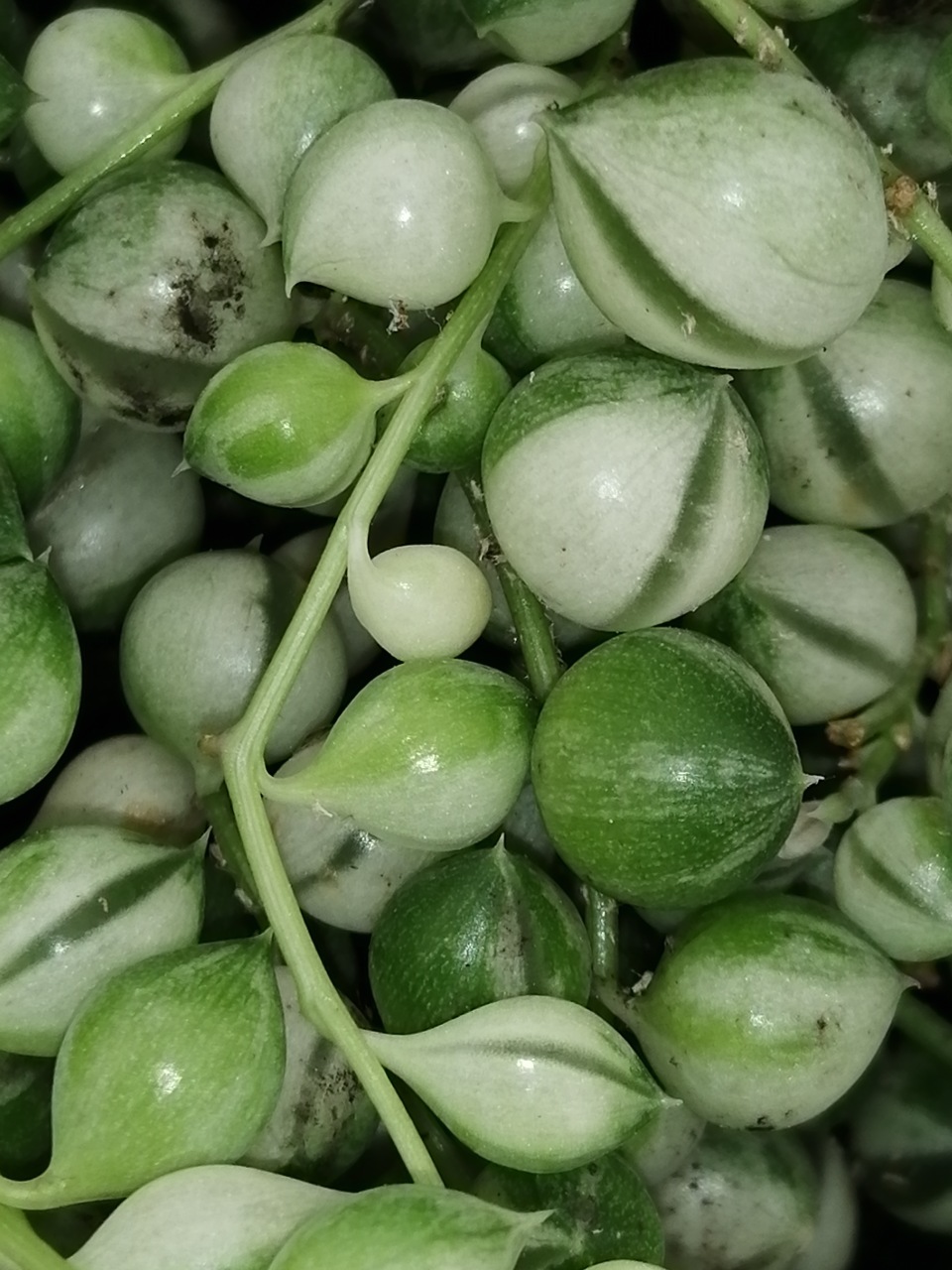 Le sue foglie carnose ricordano i grani del rosario, il che è valso alla pianta questo curioso soprannome. questa selezione è variegata di crema e viene chiamata anche string of pearls.