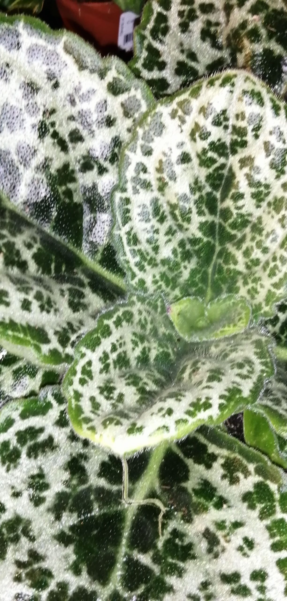 Ha grandi foglie carnose e soffici al tatto, verdi con marezzature bianche diffuse e grandi fiori lilla viola di grande bellezza.