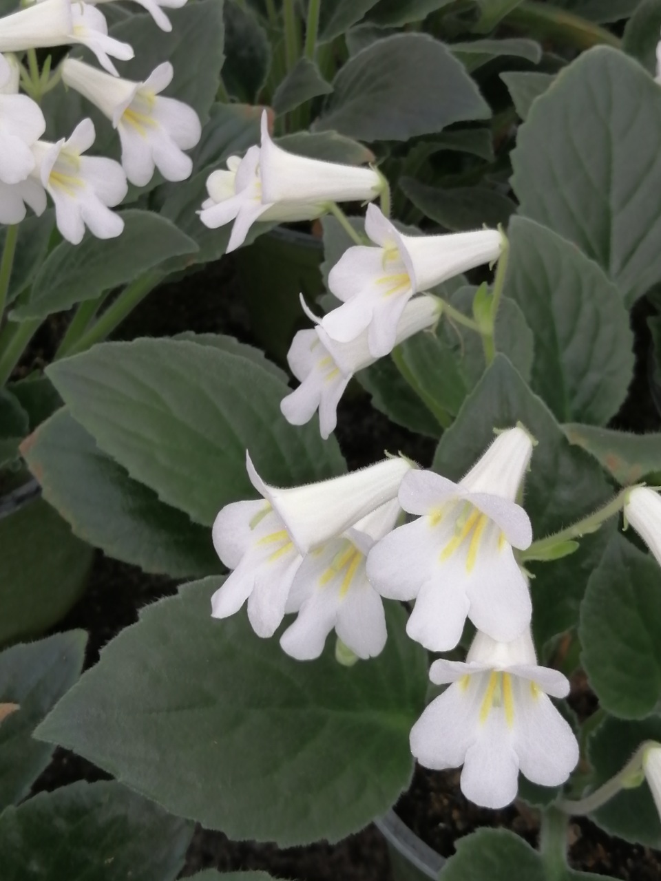 Nuova selezione a fiore bianco con venatura gialla verso la gola del fiore. Pianta di facile coltivazione e generosa nella lunga e abbondante fioritura. Fiori singoli portati al di sopra delle larghe foglie carnose e vellutate.