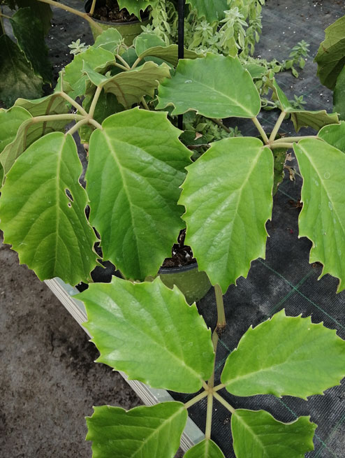 Ha grandi foglie molto ornamentali, lucide, verde brillante intenso con la pagina inferiore coperta da delicata peluria chiara.
