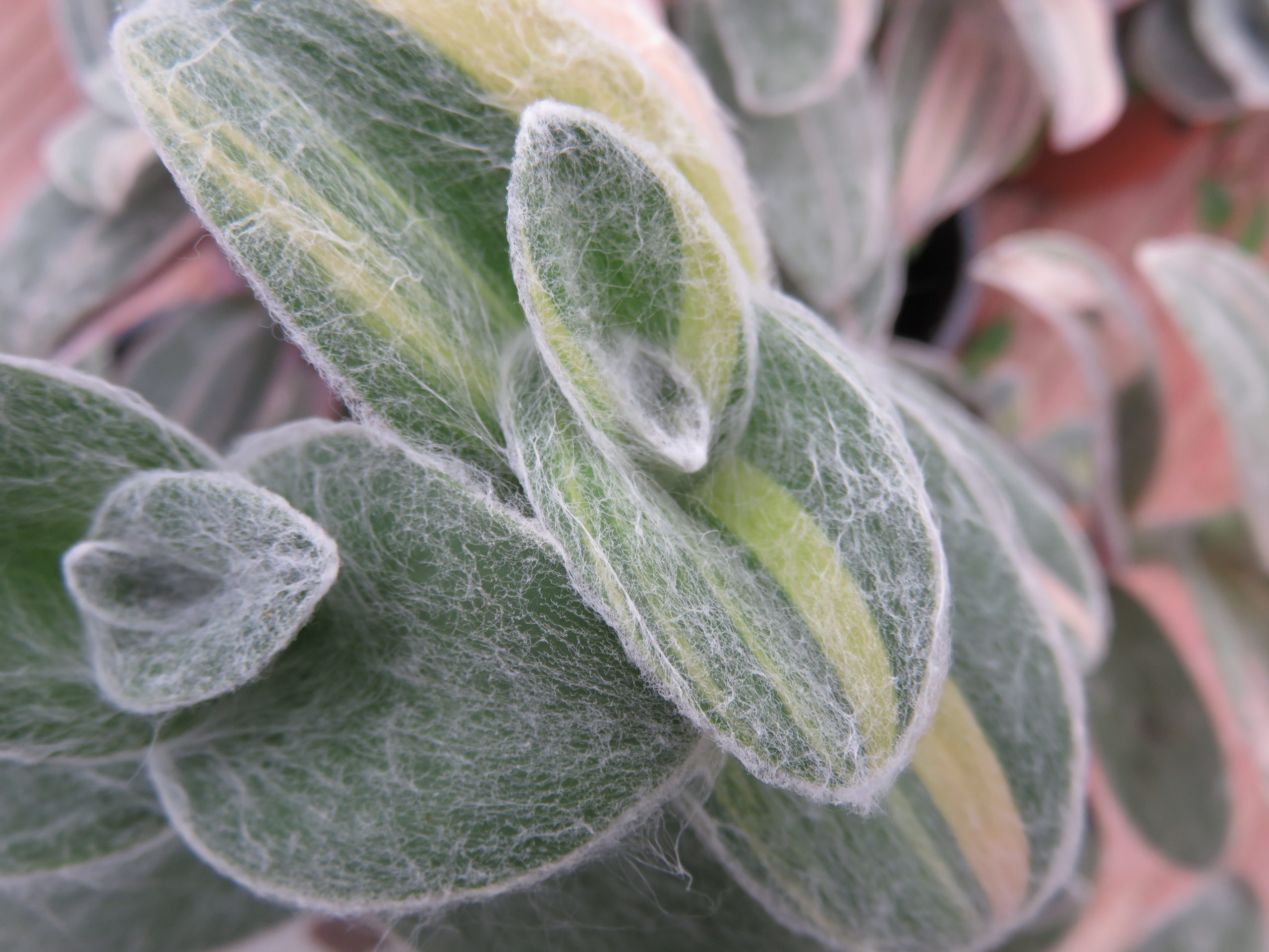 Pianta perenne, cespitosa, dalle particolarissime foglie coperte da corta e soffice peluria setosa; le foglie sono di un particolare colore, verde grigio e manifesta vistose striature giallo crema e rosate.