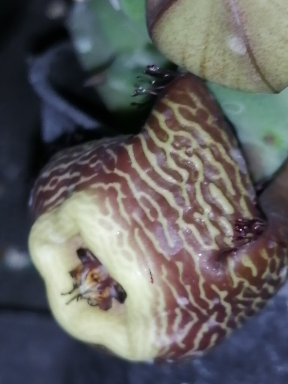 Ha grandi fiori carnosi che sbocciano durante tutta l’estate marrone con righe color giallo crema.